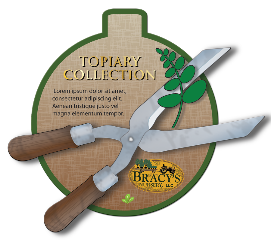 Circle hang tag designed for Bracy’s Nurseries Topiary Collection.