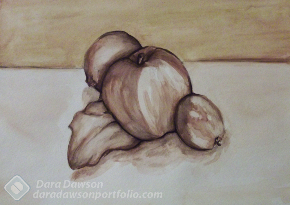 Hand drawn illustration of apples and other fruits painted in watercolor in a monochromatic palette.