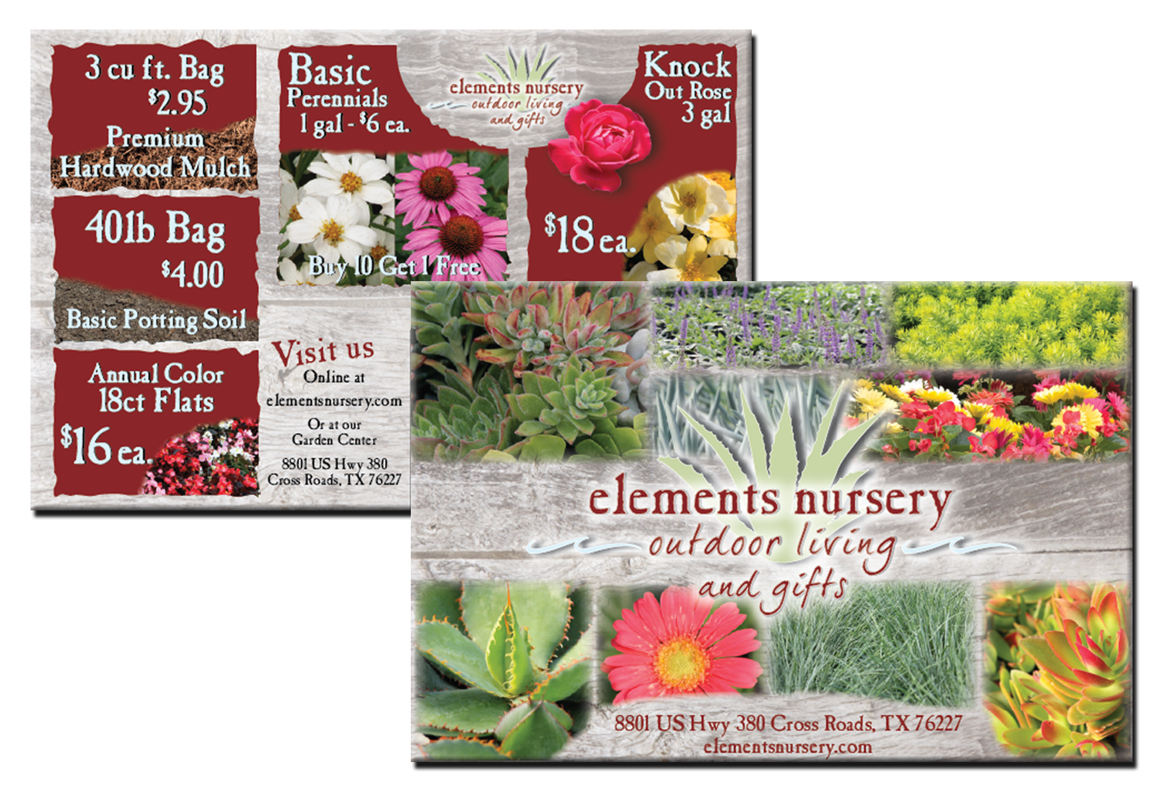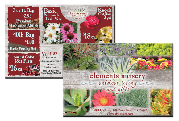 A Flyer/Postcard designed for Elements Nursery to promote their products.