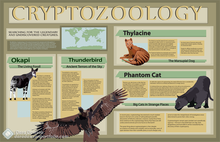 Illustrated informational graphic on cryptozoology and four famous cryptids.