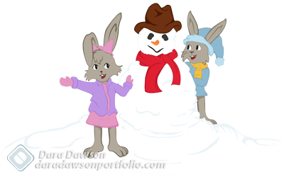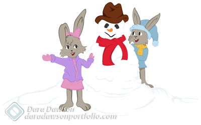 Hand drawn, then vectored illustration of a group of rabbits building a snowman for a Christmas design. Alteration of the snowman illustration with the children. Customer requested to make them animals instead.