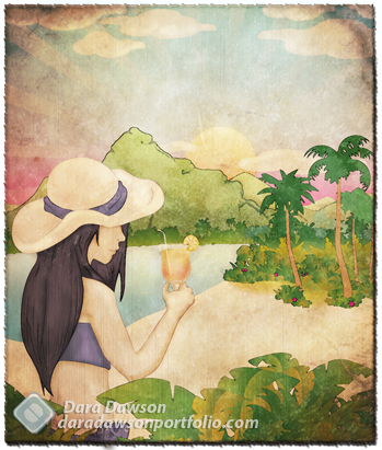 Hand drawn, then vectored and photoshoped illustration of a woman on a tropical beach.